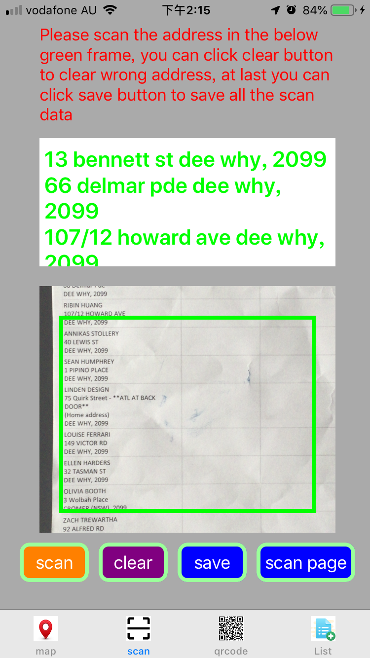 The App has four sections: map,scan,qrcode,list.Map section can input